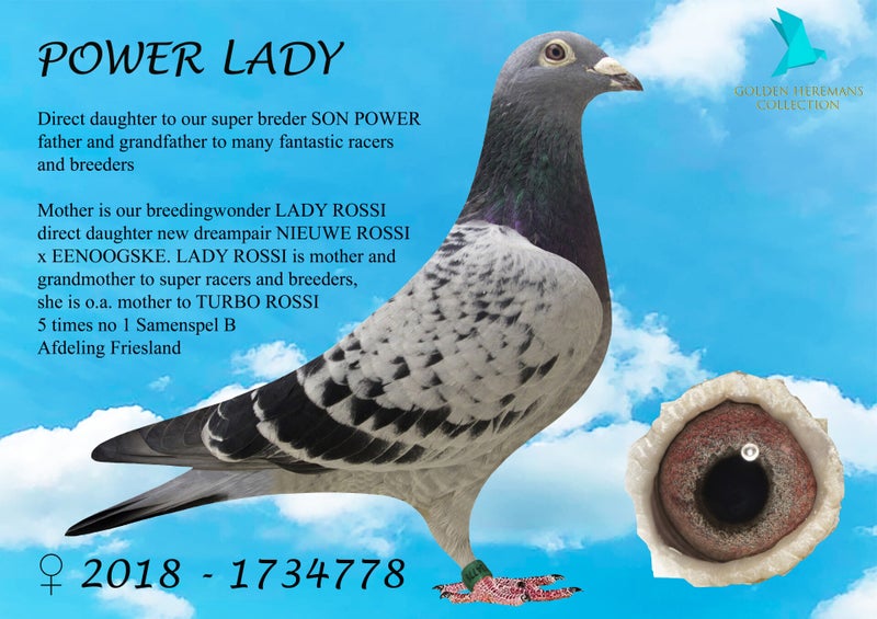 GOLDEN ROSSI is more than proven breeder, o.a. father 1e 3.305, grandfather 1th Super Ace pigeon Jaarse Toury Woubrechtegem 2018, 1th Ace pigeon Jaarse Toury Woubrechtegem 2018, 1e Ace pigeon Jaarse Groot Verbond 2018, 28th National Ace pigeon Belgium old middle distance KBDB 2019 and much much more. Paired to a proven breeding hen, she is a daughter of our famous BARON and LADY ROSSI.