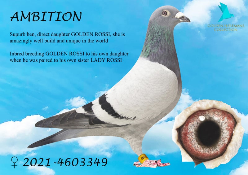 In this couple the best breedinglines from Leo Heremans come together, NIEUWE GOLDEN ROSSI is direct from super breedingpair GOLDEN ROSSI (son Nieuwe Dreampair NIEUWE ROSSI x EENOOGSKE) to LIZETH (full sister NIEUWE OYMPIADE), AMBITION is super heavy inbred to Het Nieuwe Dreampair NIEUWE ROSSI x EENOOGSKE, GOLDEN ROSSI to his own daughter FAIR LADY ROSSI, daughter GOLDEN ROSSI to LADY ROSSI