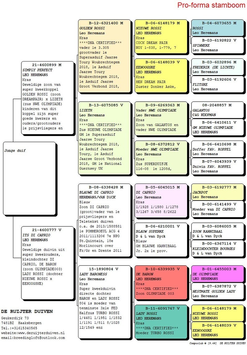 Both vVery good build pigeons, son is from the super pair GOLDEN ROSSI (son Nieuwe Dreampair NIEUWE ROSSI x EENOOGSKE) to IT'S DI CAPRIO, granddaughter worldfamous racer and breeder DI CAPRIO, also granddaughter super breeder DE BARON very last son OLYMPIADE 003 bred by Leo Heremans abd LADY ROSSI, she is also from NIEUWE ROSSI/EENOOGSKE, mother 0.a. TURBO ROSSI 5 times first Samenspel B afdeling Friesland