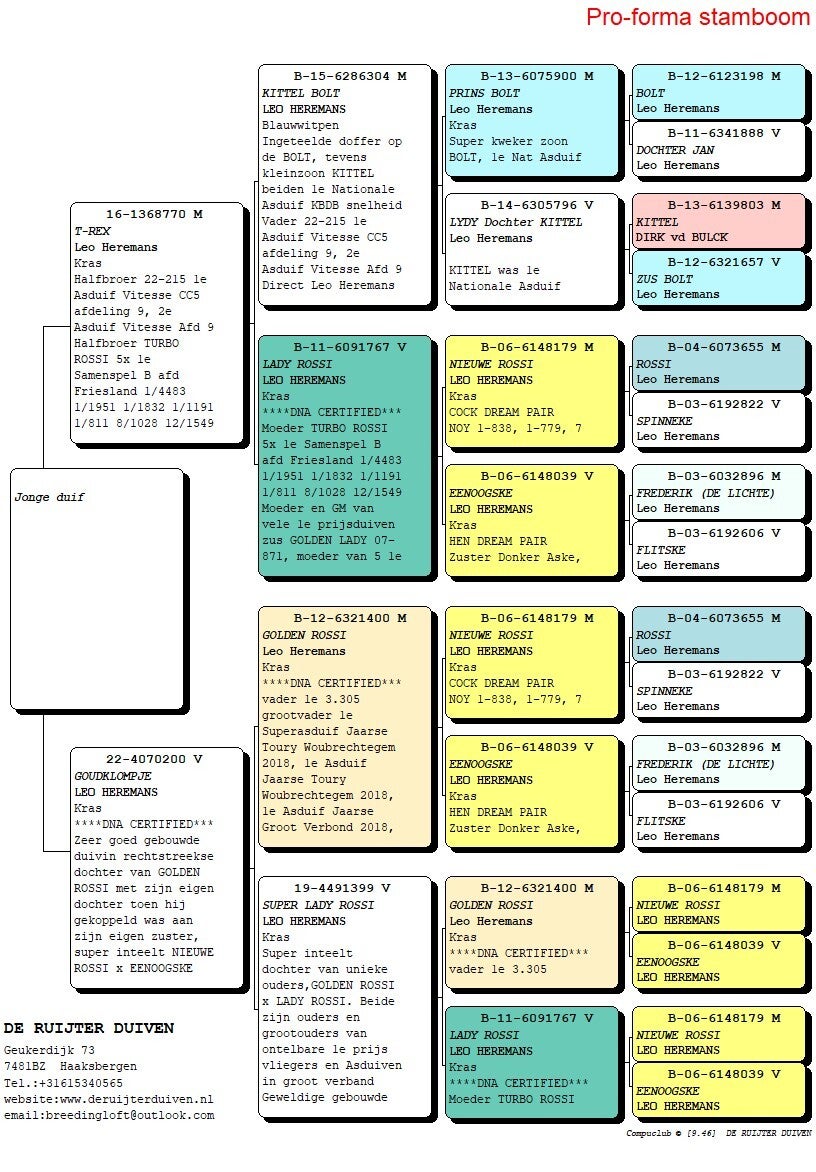 Grandfather of countless no 1 racers, Ace pigeons and breeders. LADY ROSSI is a outstanding good breeding hen, she is o.a. mother to TURBO ROSSI 5 times no 1 Samenspel B Afdeling Friesland, NICE GUY 1/4356 1/4252 1/1953, grandmother to 1/11156 7/10192 10/19075 8th National Ace Pigeon Young Middle Distance 5. NPO 3836, 5. NPO 1295, 1/3977 10/4152 12/2469 7/4152 12/2469 7/4152 17. NPO 5901 1/4332 1/6729 2/6209 26/10065 7/3325 8/6829 9th National Ace Pigeon Sprint WHZB 2019 1/8079 1/2030 1/2053 1/1954 1/1561 1/1210 1/1135 etc etc